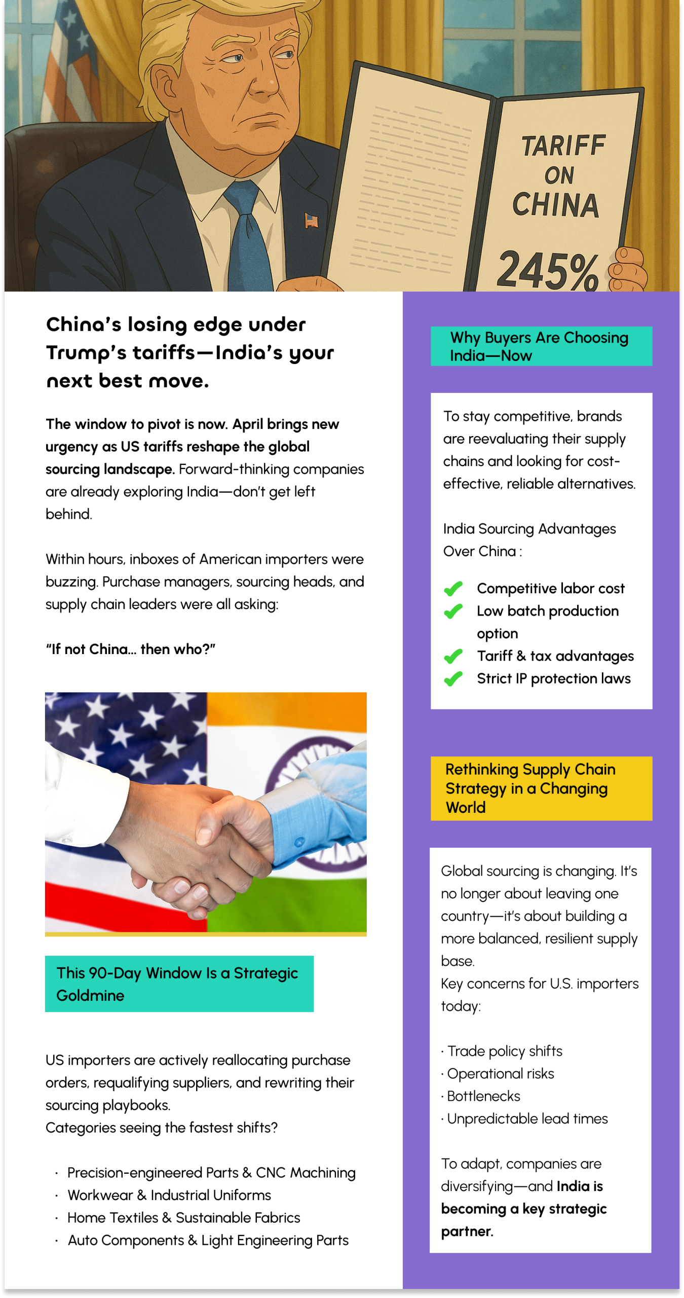 With shifting tariffs and trade tensions, global buyers are rethinking sourcing strategies. India offers tariff advantages, diversified trade agreements, and growing export incentives—making it a strong alternative to China.