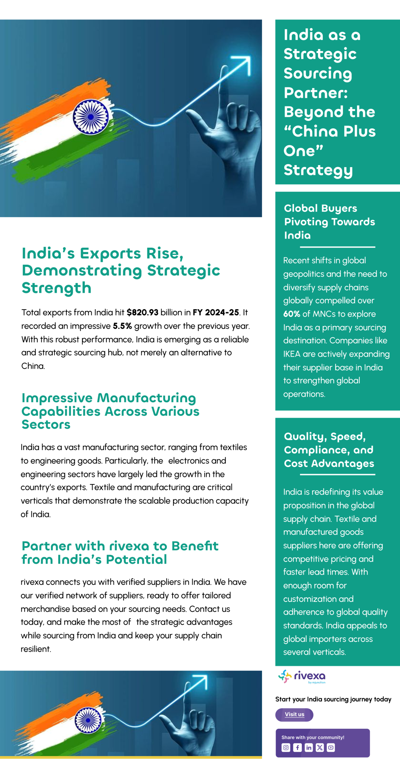India’s exports reached $820.93 billion in FY 2024–25, reaffirming its position as a strategic global sourcing hub. From textiles to engineering goods, India offers scale, speed, and supply chain resilience. As global buyers shift from China, India’s value proposition grows stronger. Discover how sourcing from India delivers on quality, compliance, and cost-efficiency.