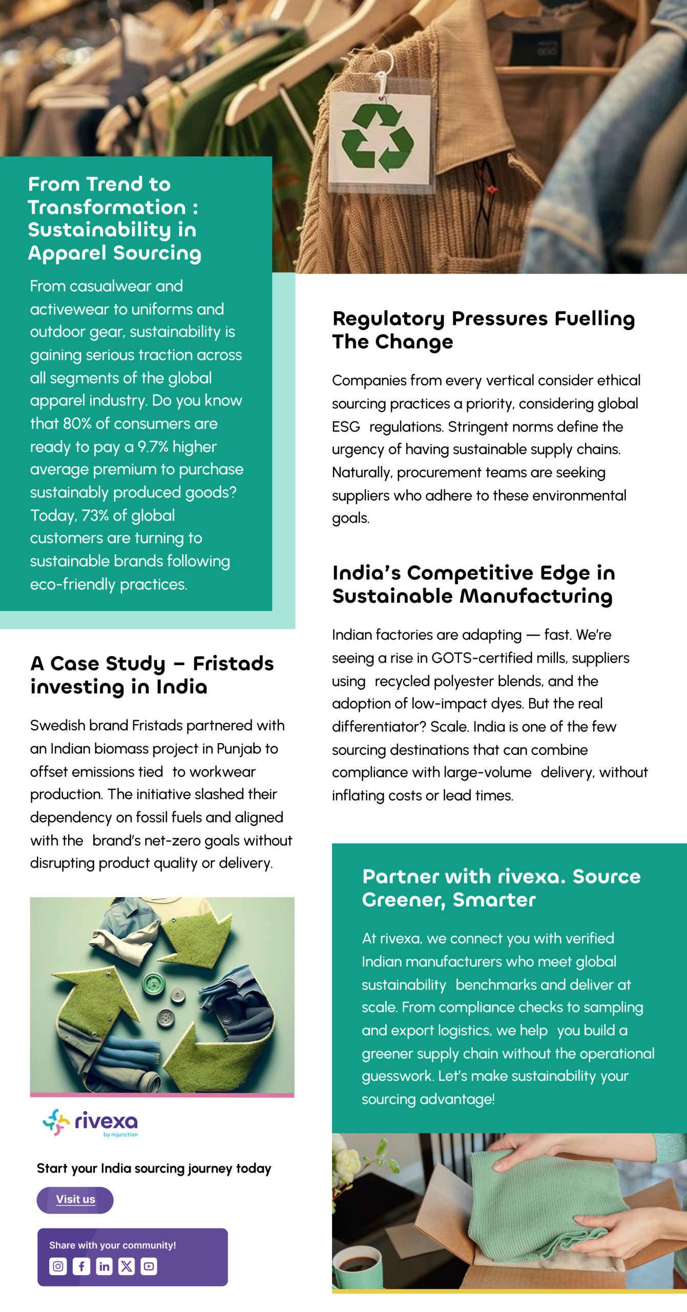 Sustainability in workwear is now a must-have, not a bonus. With rising ESG regulations and eco-conscious buyers, global brands are turning to compliant, ethical suppliers. Indian manufacturers are stepping up with GOTS certifications, recycled materials, and scalable green practices. Explore how sourcing from India helps you meet sustainability goals—without compromising on quality or timelines.