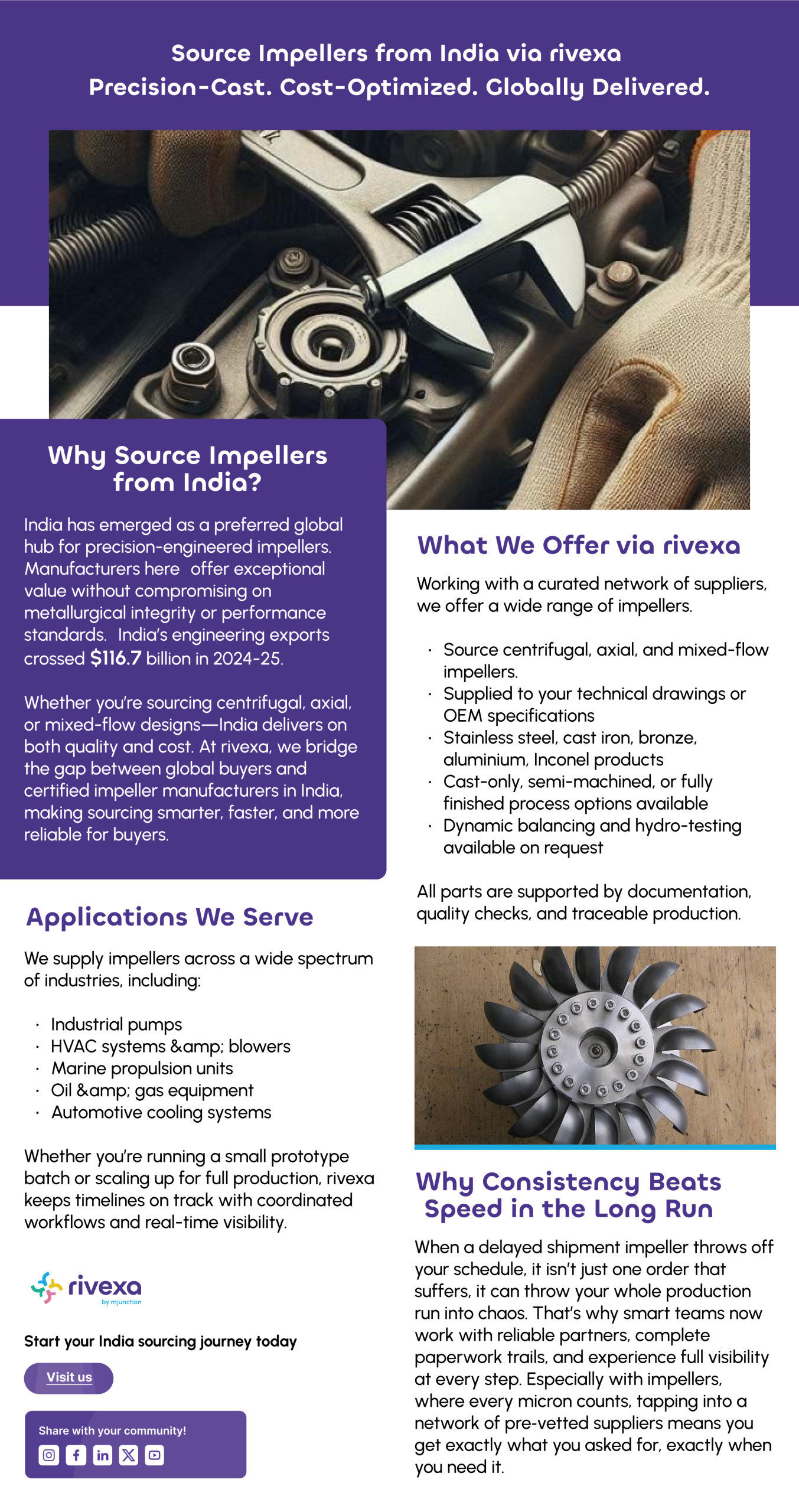 India is fast becoming the go-to source for precision-engineered impellers, offering quality, cost-efficiency, and metallurgical reliability. With rising demand across sectors like pumps, HVAC, marine, and oil & gas, Indian suppliers deliver to global specs. rivexa connects buyers with certified manufacturers, ensuring on-time delivery, quality checks, and full traceability. When precision matters, consistency is key.
