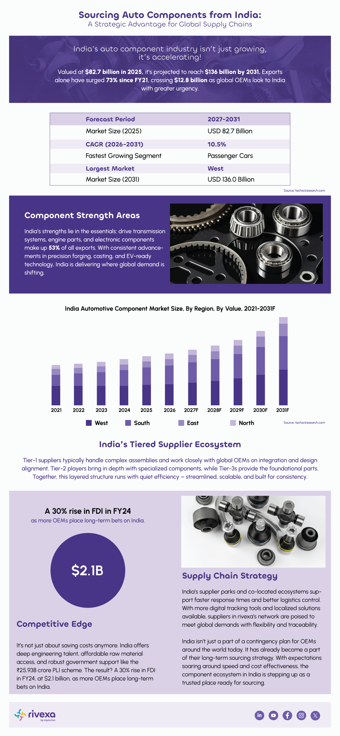 India’s auto component industry is set to hit $136B by 2031, with exports already up 73% since FY21. From engine parts to EV-ready tech, India’s tiered supplier ecosystem offers speed, precision, and cost efficiency making it a strategic sourcing hub for global OEMs.