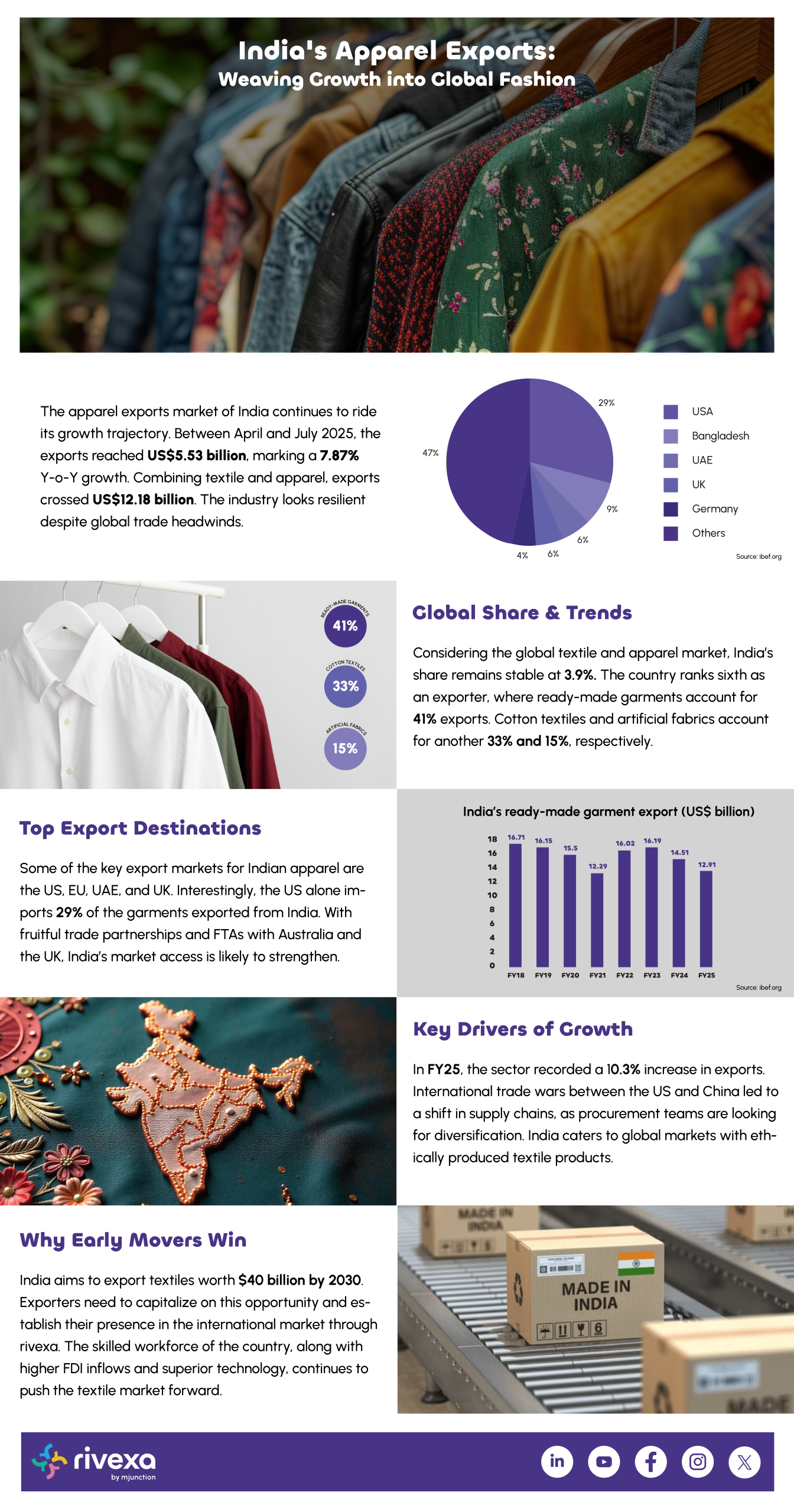 India’s apparel exports touched US$5.53B between April–July 2025, up 7.87% Y-o-Y, with textiles and garments together crossing US$12.18B. Backed by FTAs and shifting global supply chains, Indian exporters are stitching a stronger role in global fashion.
