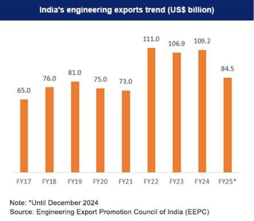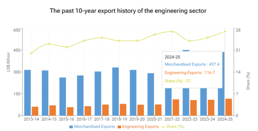 The graph shows that engineering exports from India reached a historical high of USD 116.67 billion in 2024-25.