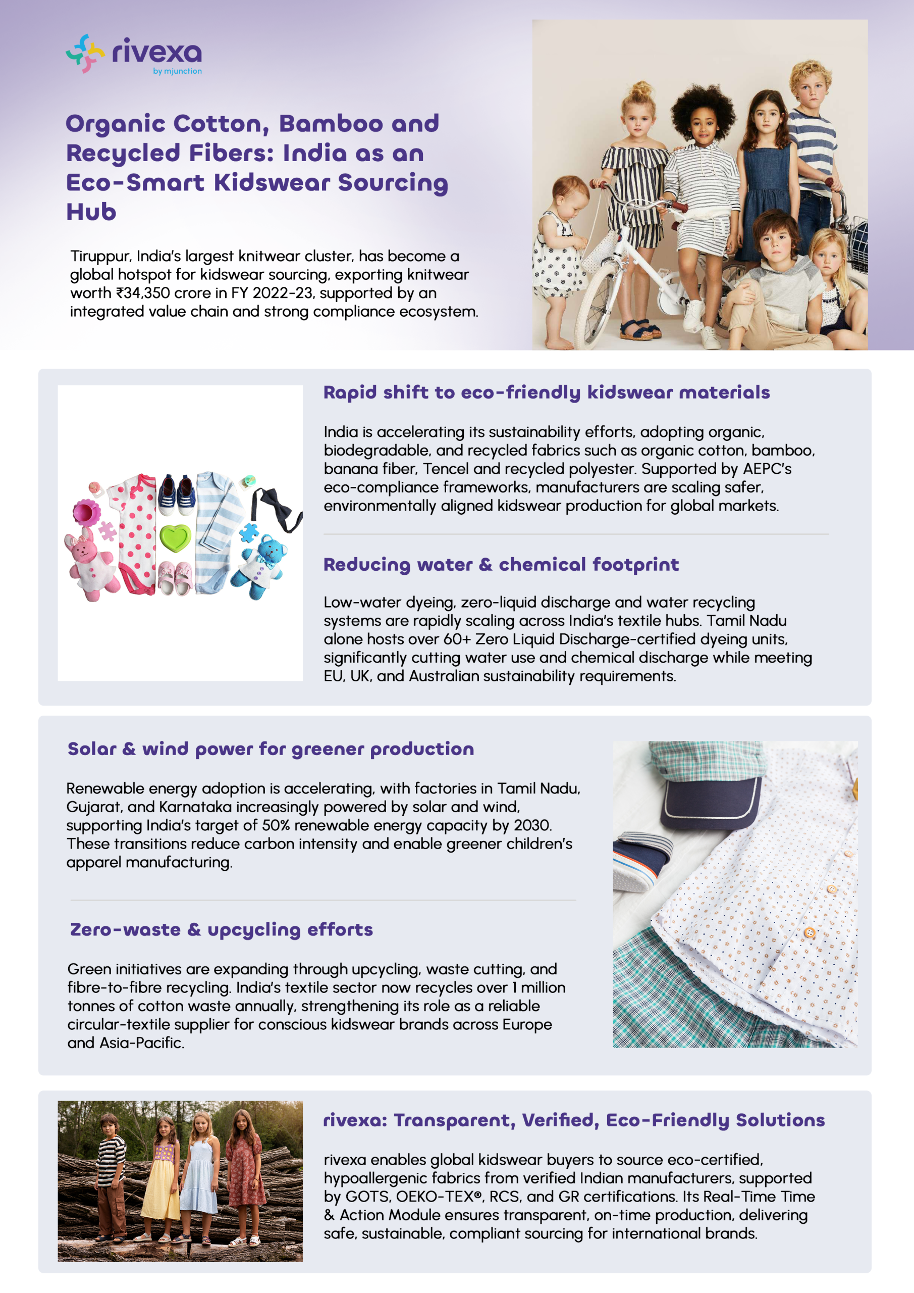 Powered by sustainable fibers, renewable energy, and circular textile practices, India is redefining global kidswear manufacturing. With strong compliance, low-impact production, and platforms like rivexa enabling transparent sourcing, India offers brands a safe, scalable, and eco-certified supply ecosystem.