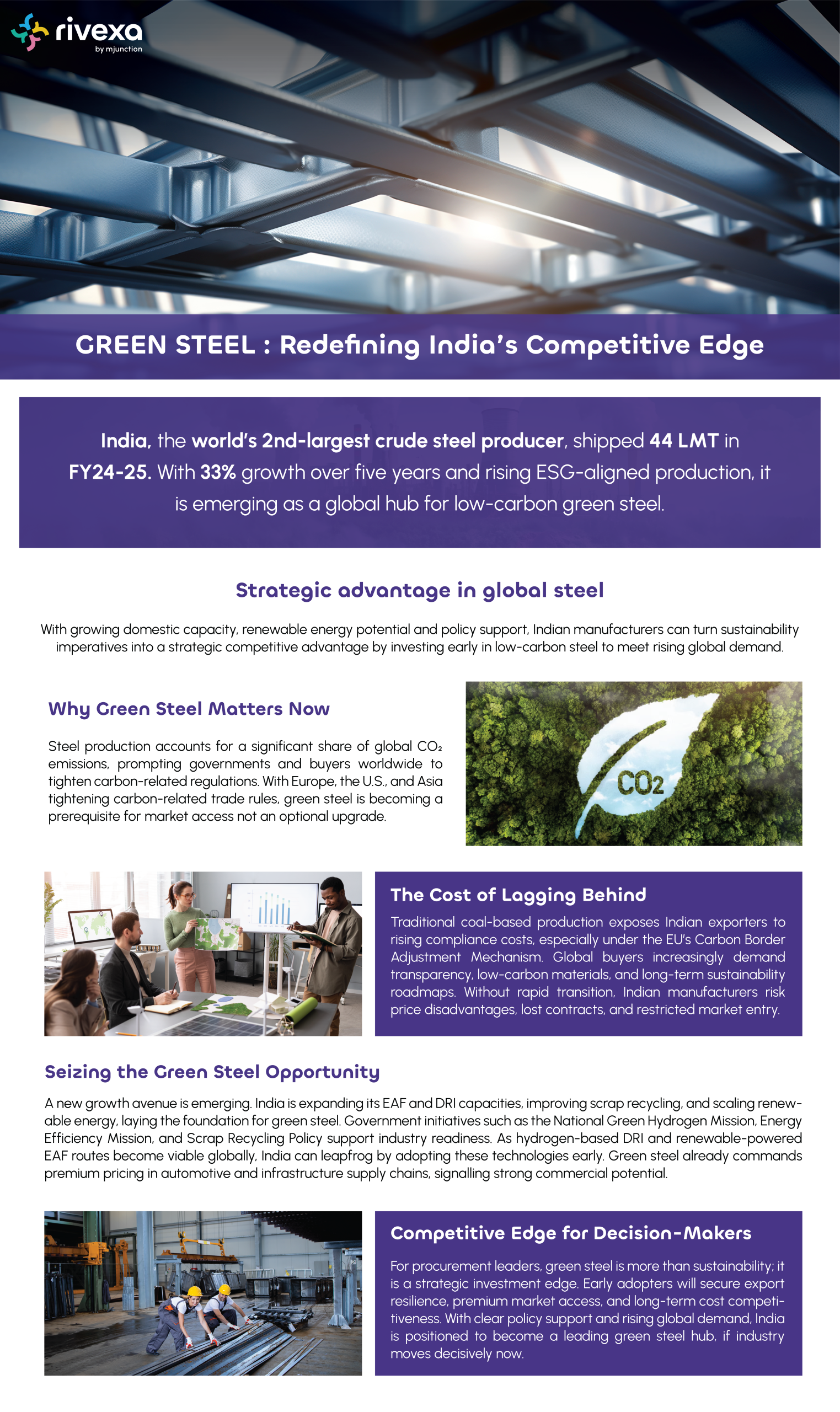 India is rapidly emerging as a global green steel hub, backed by strong production growth, expanding low-carbon technologies, and policy support. As global markets tighten carbon regulations, early investment in green steel offers Indian manufacturers a strategic edge through premium access, export resilience, and long-term competitiveness.