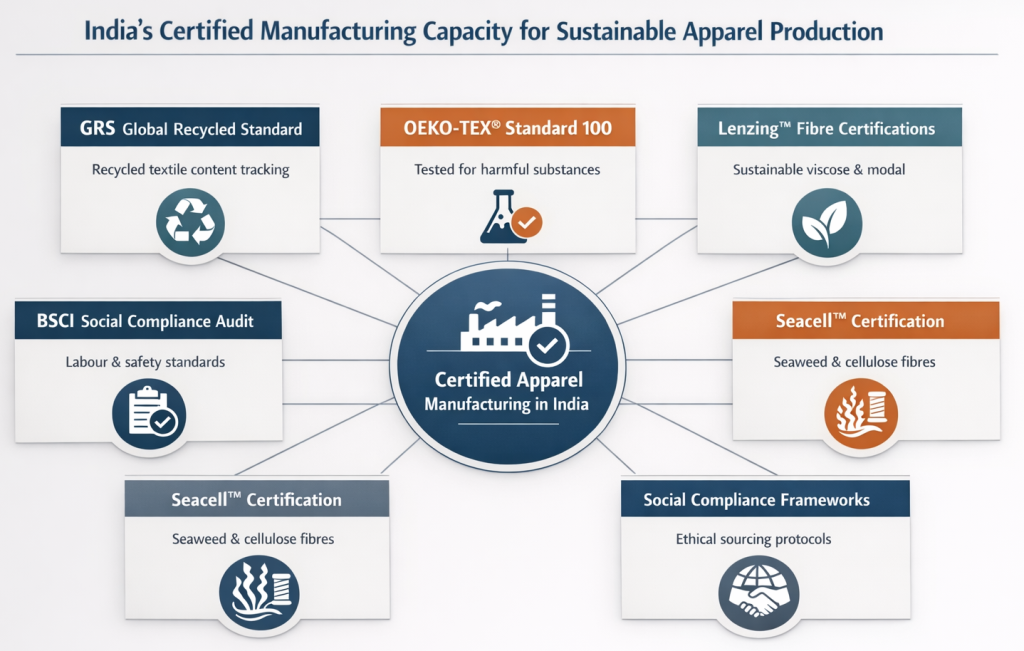 For sustainability-focused buyers in the UK and Europe, India functions as a stabilising sourcing base rather than a short-term alternative. Certification density enables factories to operate simultaneously under GRS, GOTS, Fairtrade, OEKO-TEX® and social compliance frameworks, reducing friction as brands expand their supplier bases.