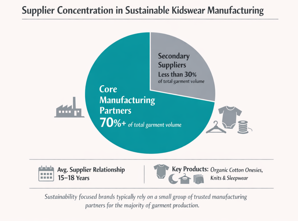 At early stages, sustainability-focused brands typically rely on a small number of long-term manufacturing partners. Across the multiple sourcing models in practice, more than 70% of total garment volumes are produced by a limited group of suppliers, with individual relationships lasting 15 to 18 years.