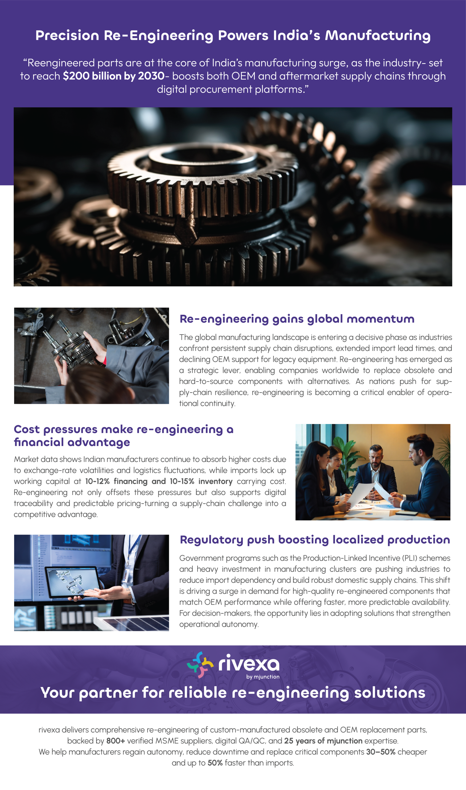 Re-engineered components are driving India’s manufacturing momentum by reducing import dependence and improving supply-chain resilience. Powered by digital procurement and localized production, re-engineering delivers faster availability, predictable costs, and OEM-grade performance for both OEM and aftermarket needs.