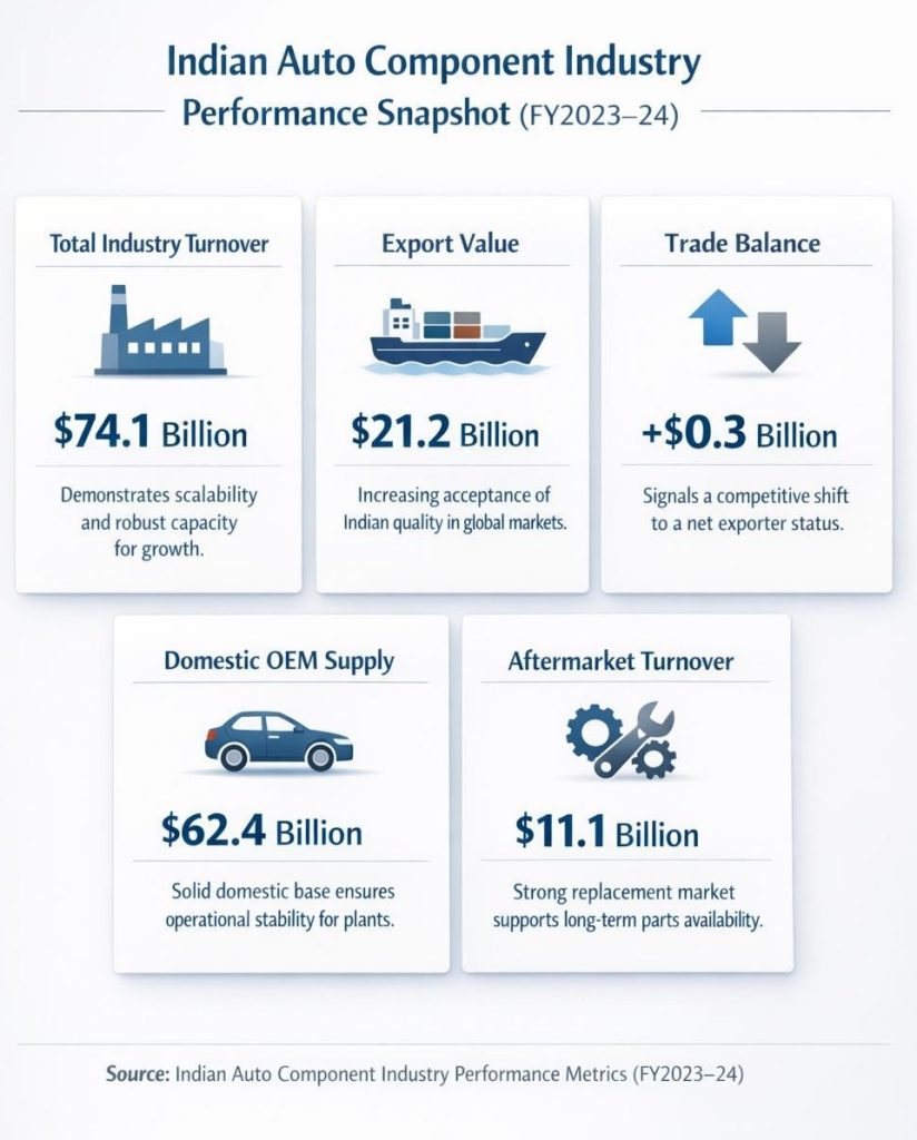 The Indian auto components sector, valued at approximately USD 74.1 billion in fiscal year 2023-24, has grown by 9.8%, defying global economic headwinds and geopolitical volatility. This expansion is driven by a sophisticated synergy of robust domestic demand, targeted industrial policy, and a burgeoning reputation for engineering excellence.
