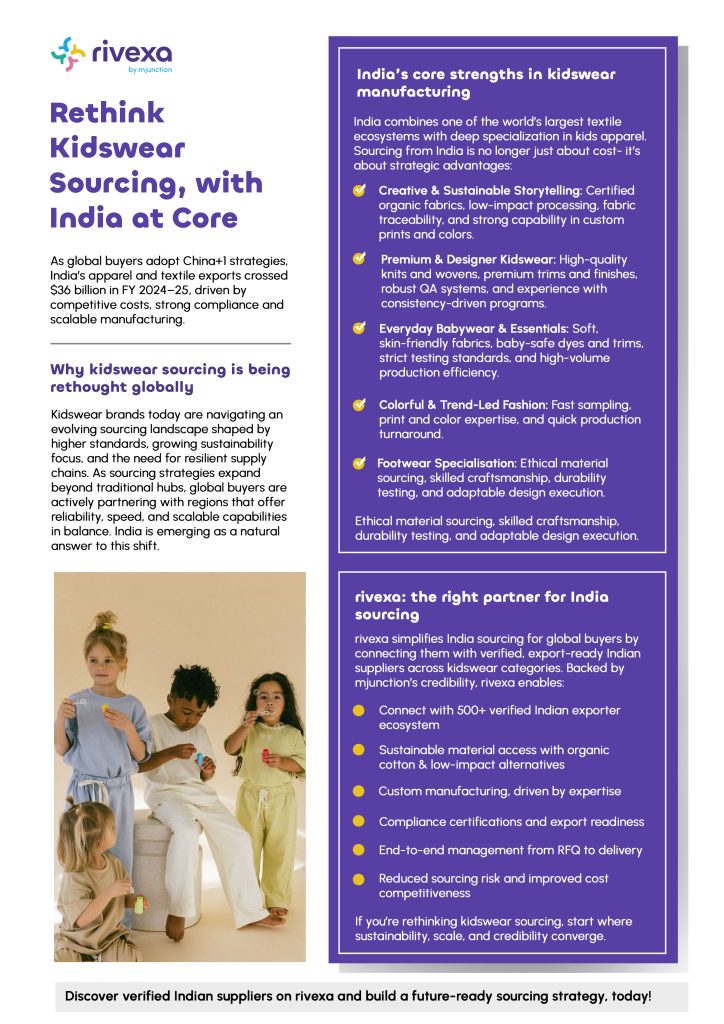 India’s kidswear manufacturing ecosystem is emerging as a global leader in sustainable, compliant production driven by integrated clusters, eco-friendly materials, and cleaner manufacturing practices. From water-efficient processing to renewable energy and circular initiatives, Indian manufacturers are aligning with global sustainability expectations.