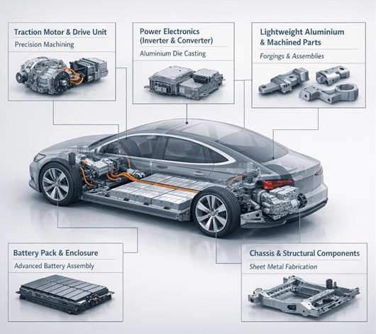 As electric vehicle adoption accelerates, the logic of automotive sourcing is being rebuilt around individual components. Industry research demonstrates that value creation in electric vehicles is increasingly concentrated in electric motors, power electronics, battery systems, enclosures, and lightweight structures. These components are sourced across international borders independently of final vehicle assembly locations (McKinsey Automotive & Assembly Insights).