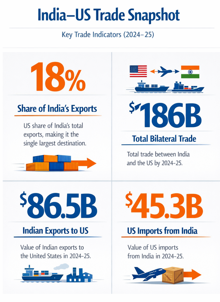 The United States remains India’s most important export market. According to government trade data, the US accounted for 18% of India’s total exports in recent years, making it the single largest destination for Indian goods spanning industries such textiles, engineering goods, jewelery, and agricultural products. Given this level of exposure, any discussion involving US tariffs naturally attracts attention across India’s export sector.