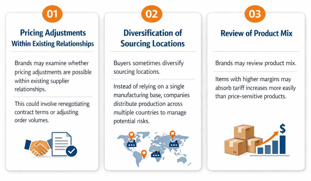 From a sourcing standpoint, tariff developments seldom lead to sudden changes in supplier relationships. Buyers tend to revise sourcing strategies incrementally. When tariffs increase or enter an unpredictable phase, several responses are common.